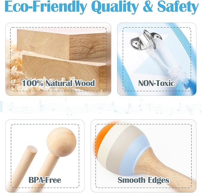 - 【Early Music Education】Boost sensory development & rhythm skills naturally! The gentle maraca shakes, rhythmic drum beats and jingling bells encourage sound recognition, which help to develop their sensitivity to music and sense of rhythm, and improve their creativity and ability to recognize musical instruments.