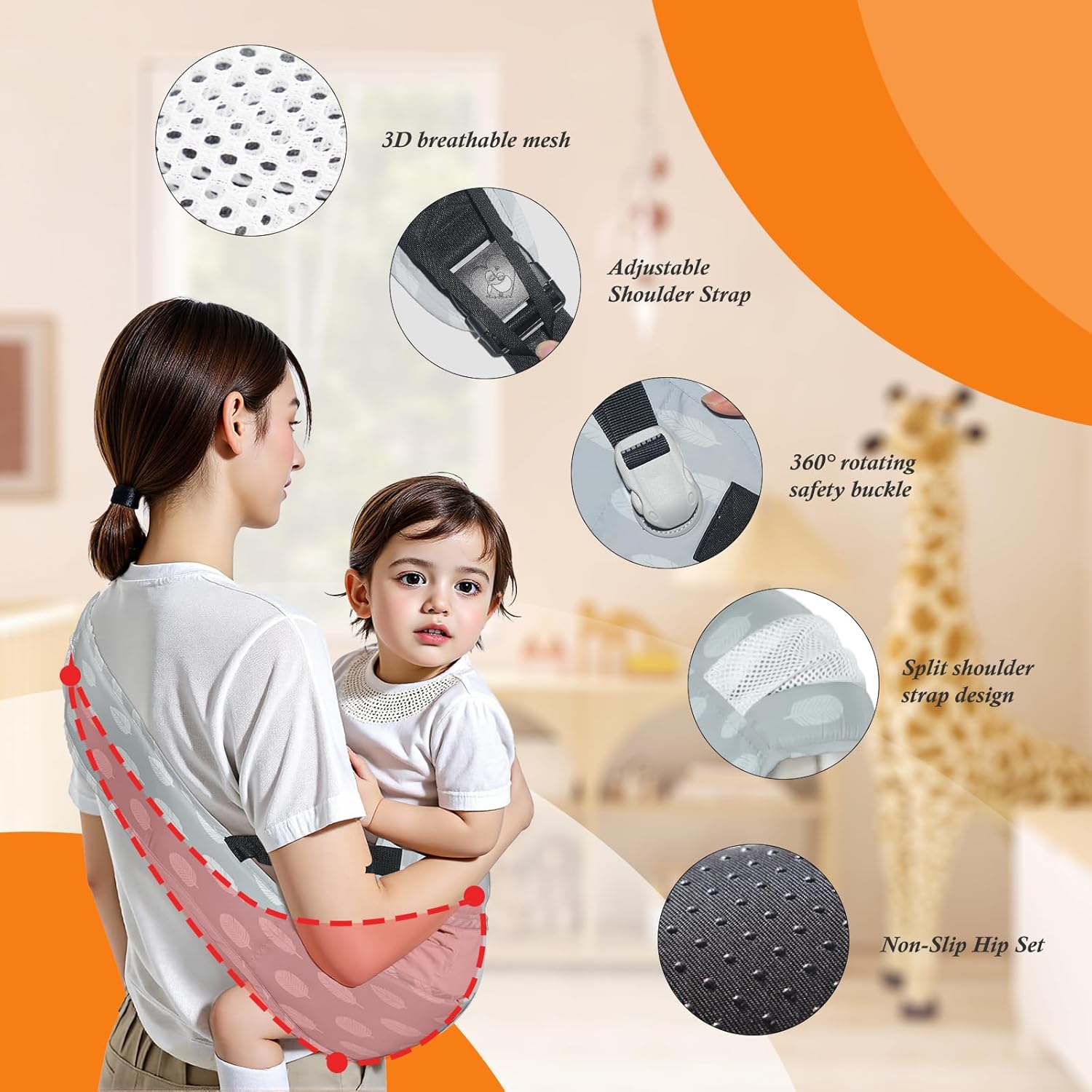 - 360°Safety and Double Protection:Equipped with a 6cm mountaineering-grade 360° rotating safety buckle and made of 600D high-density Oxford cloth, this baby carrier sling is slip-resistant and extra durable. The 10cm anti-slip safety rope provides additional protection, ensuring your child’s safety, making it an ideal toddler hip carrier for both everyday and outdoor use.