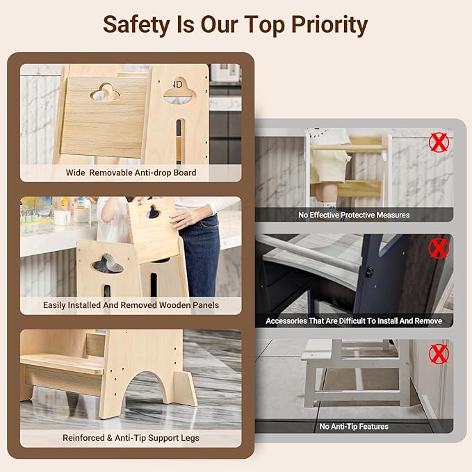 - Wide Anti-Drop Board: Designed for safety, this learning stool features a spacious, removable anti-drop board that ensures your child will never have to worry about falling. Easy to install and remove, it allows kids aged 3 and up to use it independently, giving parents peace of mind while their little ones explore and learn in the kitchen.