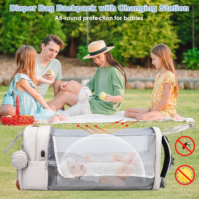 - Multifunctional Baby Bag: Our diaper backpack is not only for storage but also a portable diaper changing station with a comfortable pad and mosquito net. Protect your baby better outdoors. The baby diaper bag has a USB charging port on the side (Built with power cable, you have to connect your cable with your power bank to charge the phone)