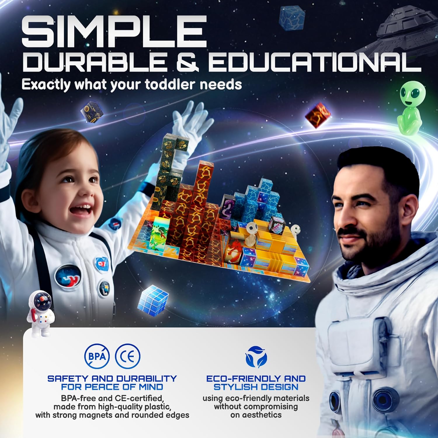 - PREMIUM QUALITY & SAFE DESIGN – Made with BPA-free, CE-certified, eco-friendly materials. Features durable construction, strong magnets, and child-safe rounded edges. Fully compatible with other 2x2cm magnetic blocks — expand your universe with ease.