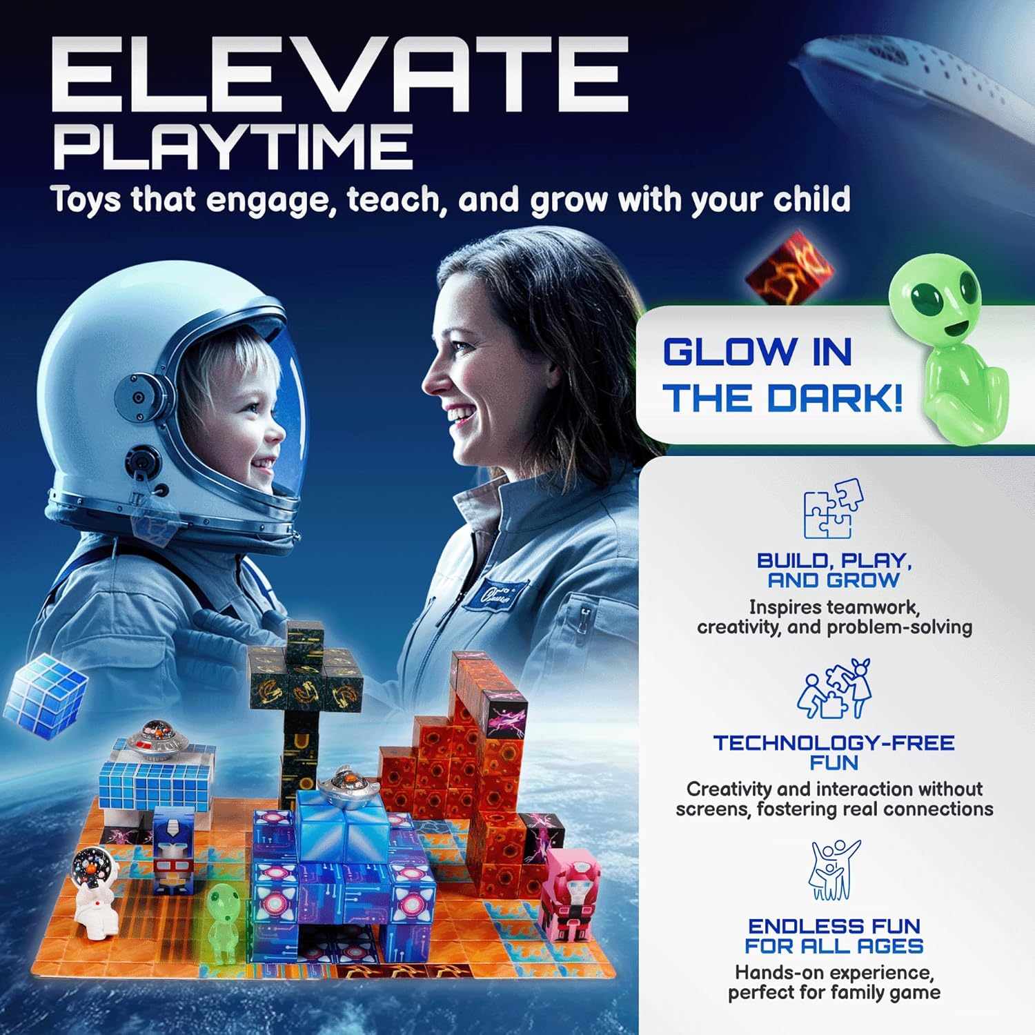 - GALACTIC GLOW-IN-THE-DARK ALIENS & LIGHT-UP FIGURES – Time to embark on an interstellar adventure! Unlike standard magnetic block sets, PlayIQ features glow-in-the-dark aliens, astronauts, and LED-powered characters that light up, adding excitement for day-to-night play.