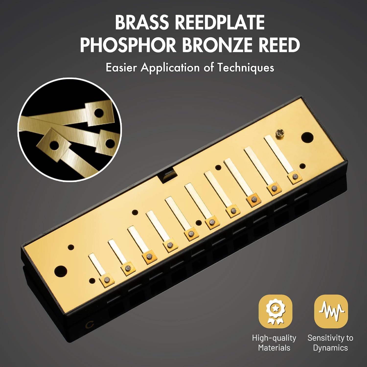 - [Quality and Inexpensive]The phosphor bronze reed and brass plate used in the harmonica are sensitive to airflow and sound transmission. Every harmonica key is precisely adjusted to produce the desired tone. Professional harmonica standards are followed in the construction of this harmonica. It may be used by beginners to practice techniques like overdrawing and overblowing.