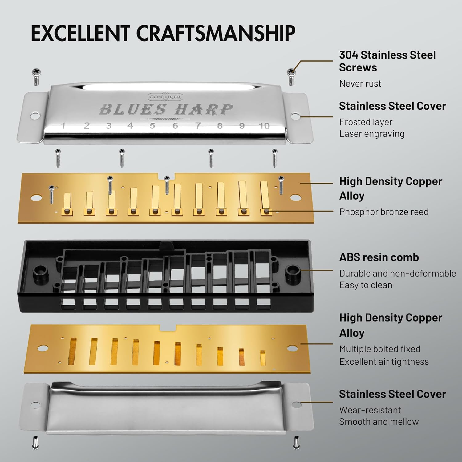 - [Upgrade More Keys]CONJURER harmonica is a beginner-friendly, advanced version of the blues harmonica. This harmonica offers different options: harmonica in 7 different keys. This Diatonic harmonica is not your typical beginner harmonica; rather, it's more akin to a professional tuned diatonic harmonica.