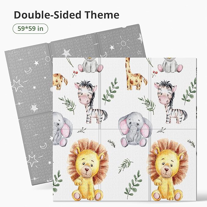 - REVERSIBLE BABY FLOOR MAT: The reversible baby mat for floor features attractive patterns on both sides, cute and lively animal patterns and simple gray starry sky theme. Our baby play mat foldable looks great in the living room and bedroom, kids mat will be a beautiful decoration for your room. In addition, the animal patterns help develop baby's cognitive ability, the raised pattern and numbers help develop baby's perception and learning ability.