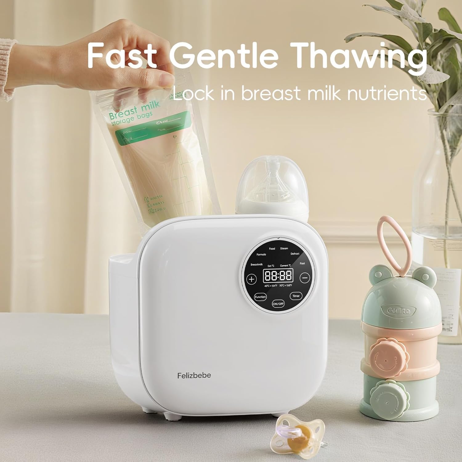 - Easy to Use: Fast Warming /Precise Temperature Control/Defrost/Breastmilk Warming/Formula/Timer/Keep Warm/ Steaming / Food Heating/Water Bath Warming. Multi function, all in one with smart one tap.High aesthetic fashion forward breast milk warmer—a practical choice for modern moms.