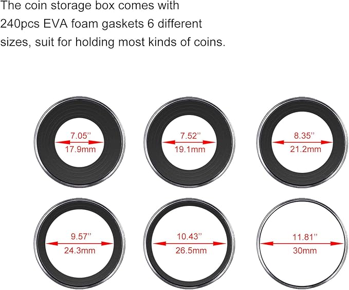 - [6 Sizes Foam Gasket]: 6 Sizes 17.9/19.1/21.2/24.3/26.5/30mm foam gasket. Different EVA foam gaskets can hold most popular coins, easy to separate the foam rings from the EVA foam pads based on your coin's size, stop coins from sliding and scratching