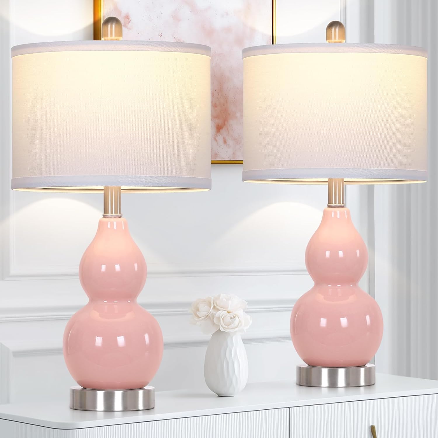 22" Double Gourd Ceramic Table Lamps Set of 2, Pink Modern Bedside Lamps for Living Room, Contemporary Nightstand Desk Lamps for Bedroom End Table Home Office Decor(2 LED Bulbs Included)