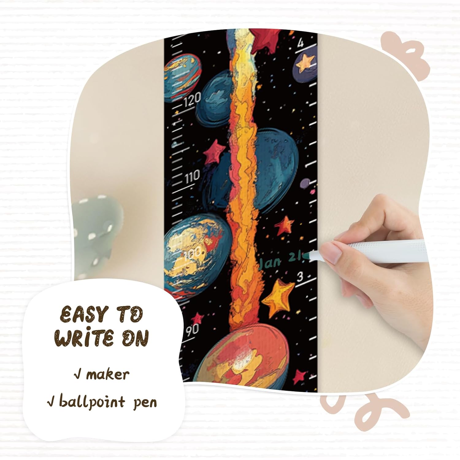- Design: Kids growth chart with rope at the top of the chart, easy to install and removeable, foldable and portable design, easy to store, hang, roll up, transport, and save space. It boasts a material that's easy to write on, where you can use dark colored ballpoint pens and markers to track growth milestones. Our height ruler can clearly show your kids' height.