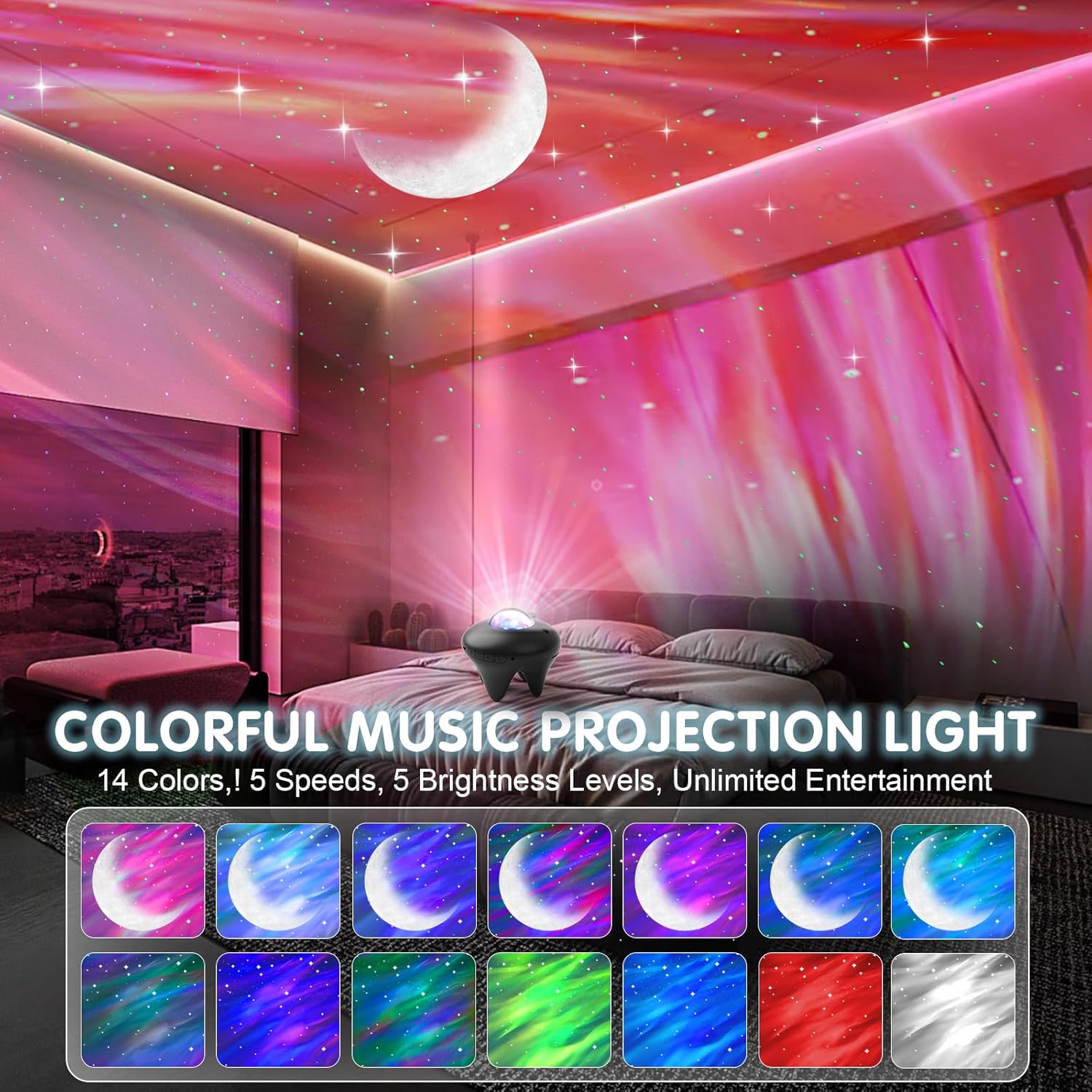 - 【Wonderful Music】The northern lights projector can play moving music through bluetooth connection on a mobile phone. After upgrading the sound quality effect, turn on the music mode and the lights will dance to the music, which is very suitable for family gatherings and parties.