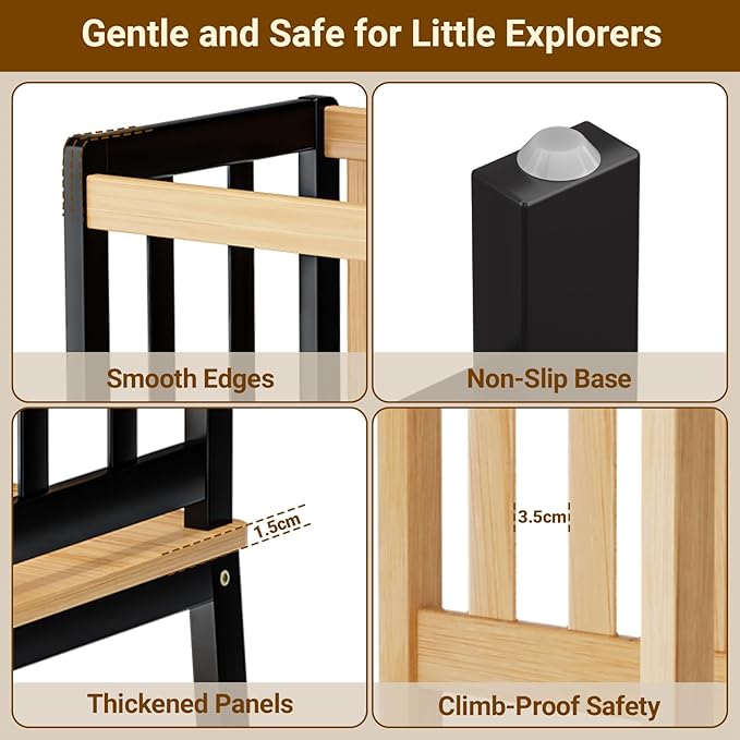 COSYLAND Toddler Kitchen Stool Helper – Stable A-Frame Design Kids Kitchen Step Stool with Protective Crossbar – Wooden Toddler Standing Tower for Learning in Bathroom (Black & Natural)