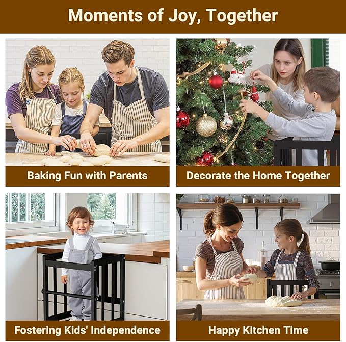 - Hands-Free Convenience – No more juggling your little one while cooking or constantly being pulled to pick them up! This standing tower safely elevates your little one to counter height, keeping them close and engaged. Whether they're helping, observing, or just being your taste tester, you’ll have the freedom to work with both hands while your child enjoys the view and stays within reach