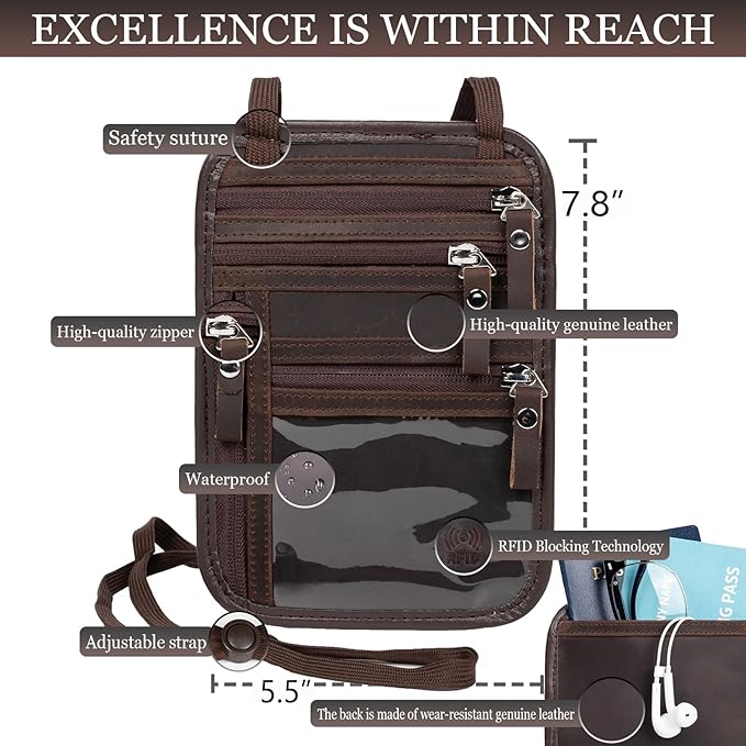 - Spacious And Organized – Size 7.8*5.5in, A Stylish, Easy-To-Use Design, That’S Comfortable And Lightweight. With Zippered Pockets, A Velcro Patch, And A Clear Id Window. Fits Passports & Large Smartphones, Cash, And Tickets.