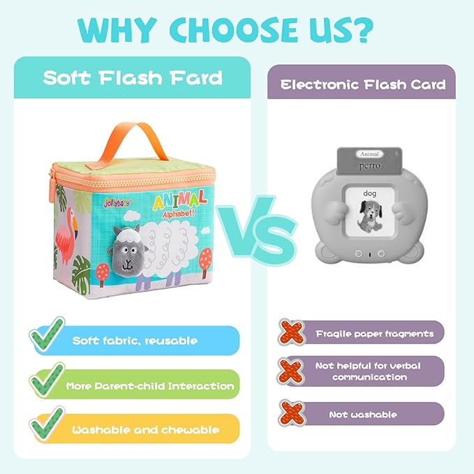 Jollybaby Reusable Soft Cloth ABC Alphabet/Letters Animal Flash Cards for Baby 0-3-6-9-12-18 Month, Curious Baby First Words Learning Activity Flashcards, Tummy Time Toy Gift for 1 Year Old Boy Girl