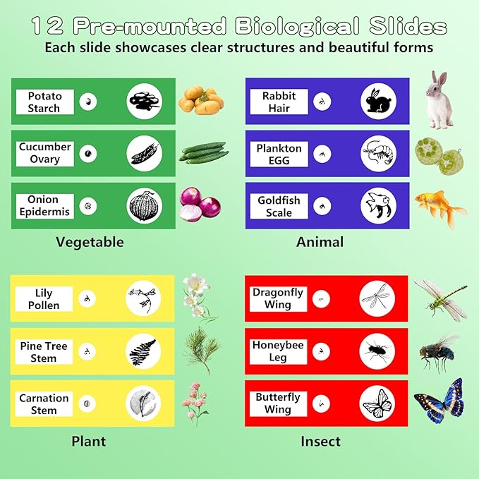- 12 Extra Slides & Perfect Gift: Includes 12 carefully selected plastic slides covering four categories: plants, vegetables, insects, and animals. Each slide showcases clear structures and beautiful forms, blending education with fun. This toys for ages 5-7 set is both entertaining and educational, making it an ideal gift for boys and girls aged 3 to 12 on birthdays, holidays, Christmas, or as a learning reward.