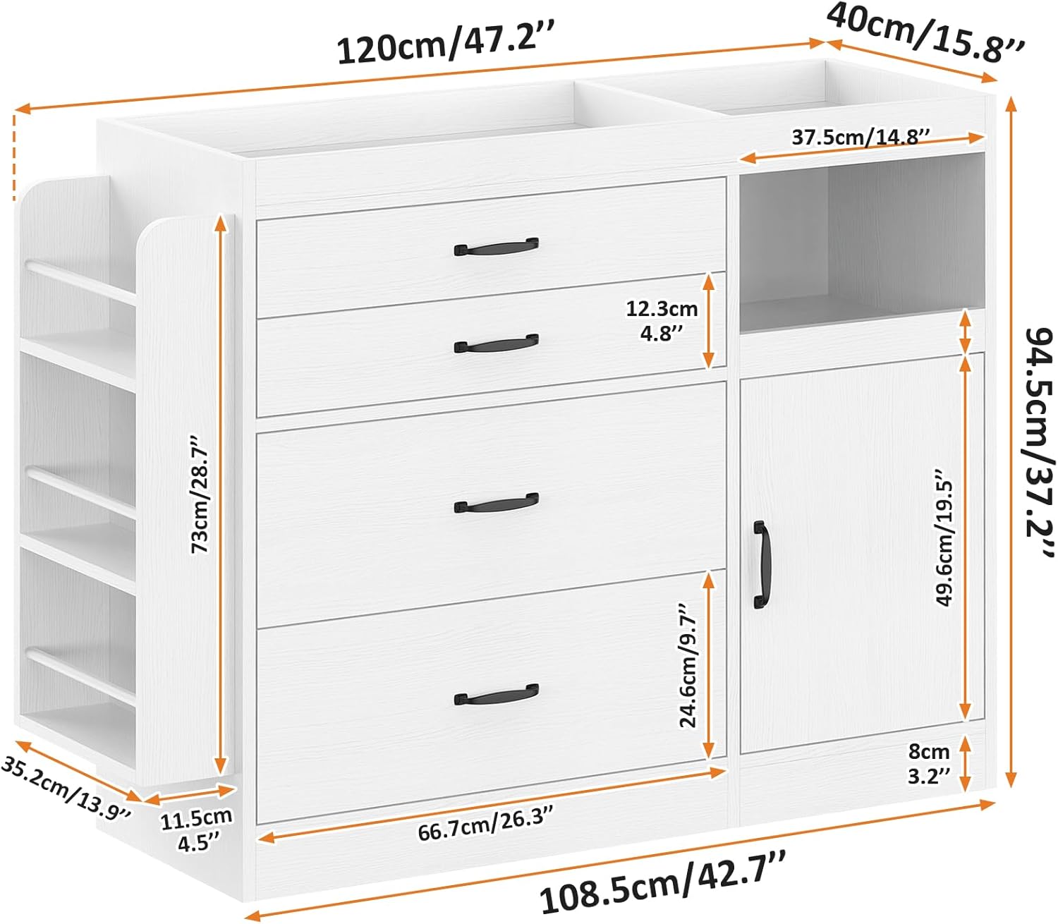 - All-in-One Nursery Dresser: This versatile piece combines a diaper changing station, a 4-drawer dresser, a closed cabinet, and 3 open bookshelves—everything you need to organize your baby’s nursery in one sleek unit. No more cluttered spaces; keep diapers, wipes, clothes, toys, and bedtime stories all within arm’s reach.