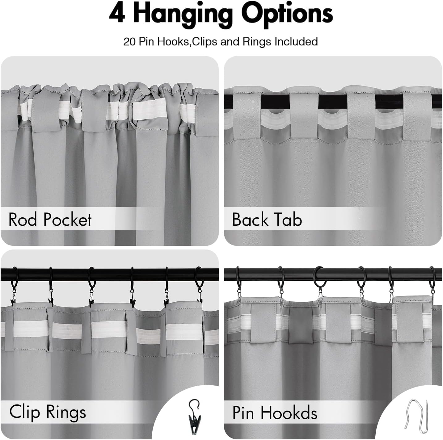 - MULTIPLE HANGING OPTIONS:Each curtain panel has 3-in-1 top style design: Rod Pocket, Back Tab and Pinch Pleat.We will include 20 pin hooks and clips for each pair of curtains (rings included)