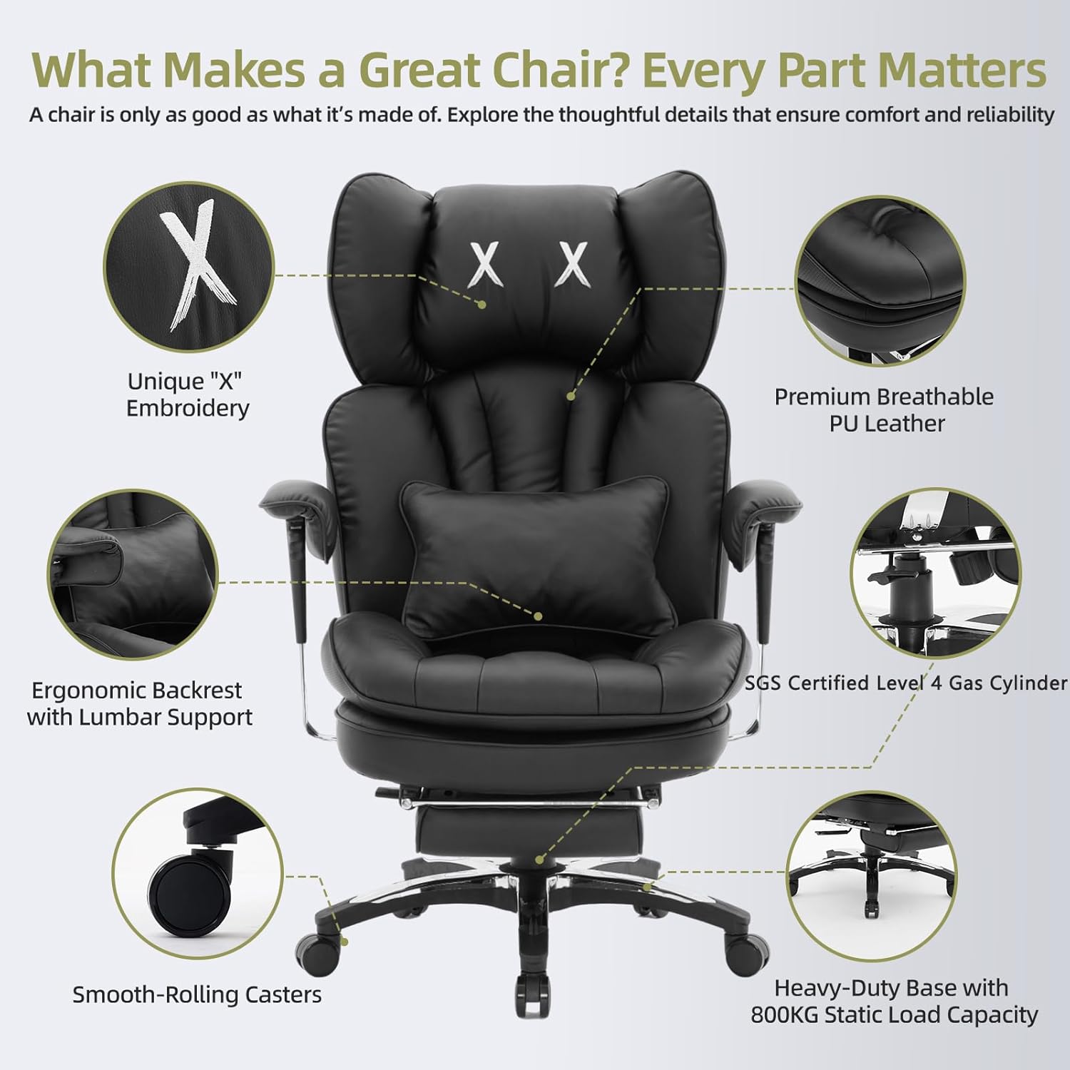 - Ergonomic Office Chair for Ultimate Comfort: This high-back office chair is designed to follow the natural curve of your spine, helping reduce back strain and fatigue during long hours of sitting. This office chair with lumbar support includes a thick headrest and padded lumbar pillow for enhanced neck and lower back comfort.The big and tall office chair with an extra-wide, deep seat cushion offers a custom fit for optimal comfort. Ideal as a computer chair, gaming chair, executive office chair.