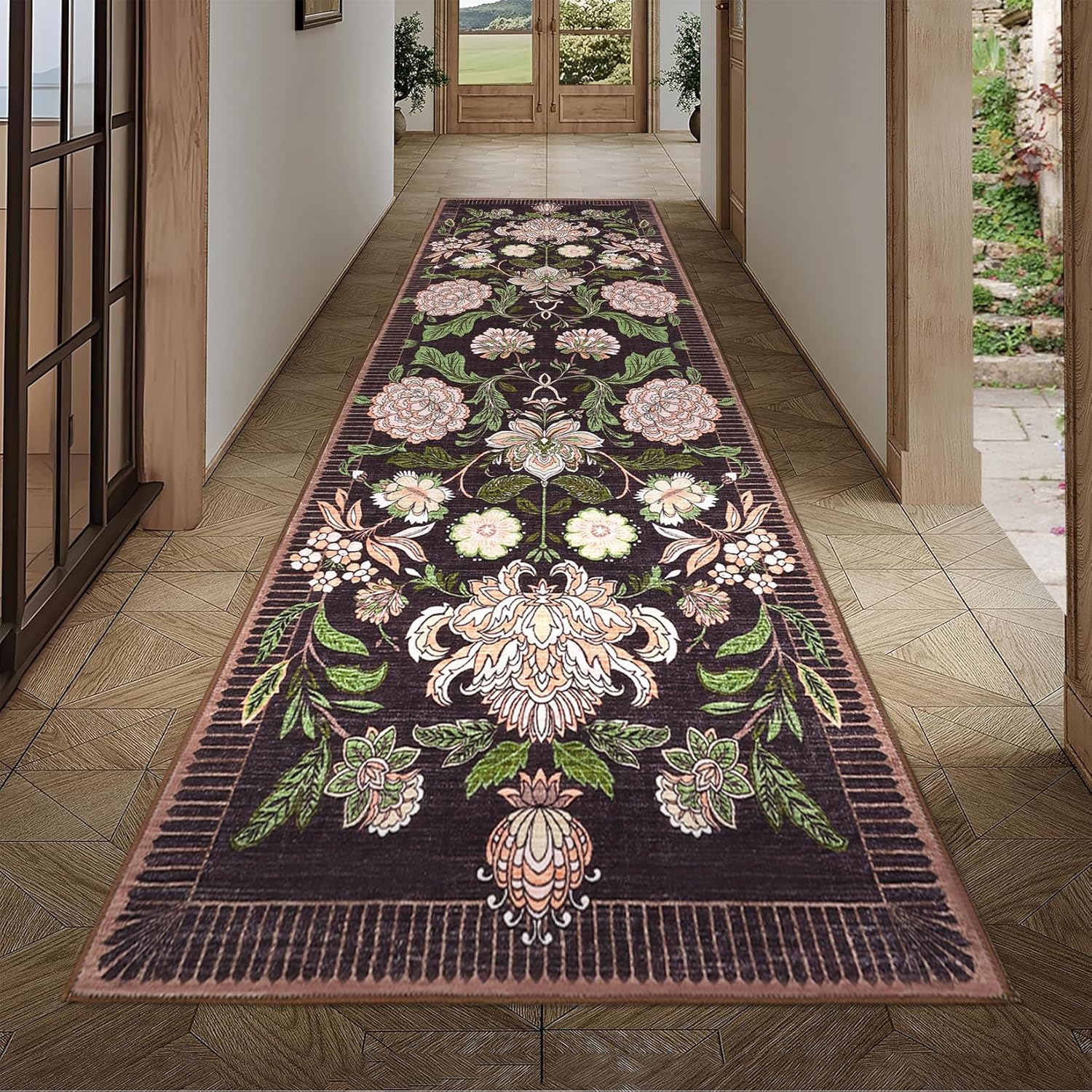 GarveeHome Plum Pink Floral Botanical 2x6 Washable Kitchen Runner Rugs Non Slip Black Purple Vintage Boho Cottage Long Rug for Hallways Bedroom Entryway Bathroom Mat with Rubber Back
