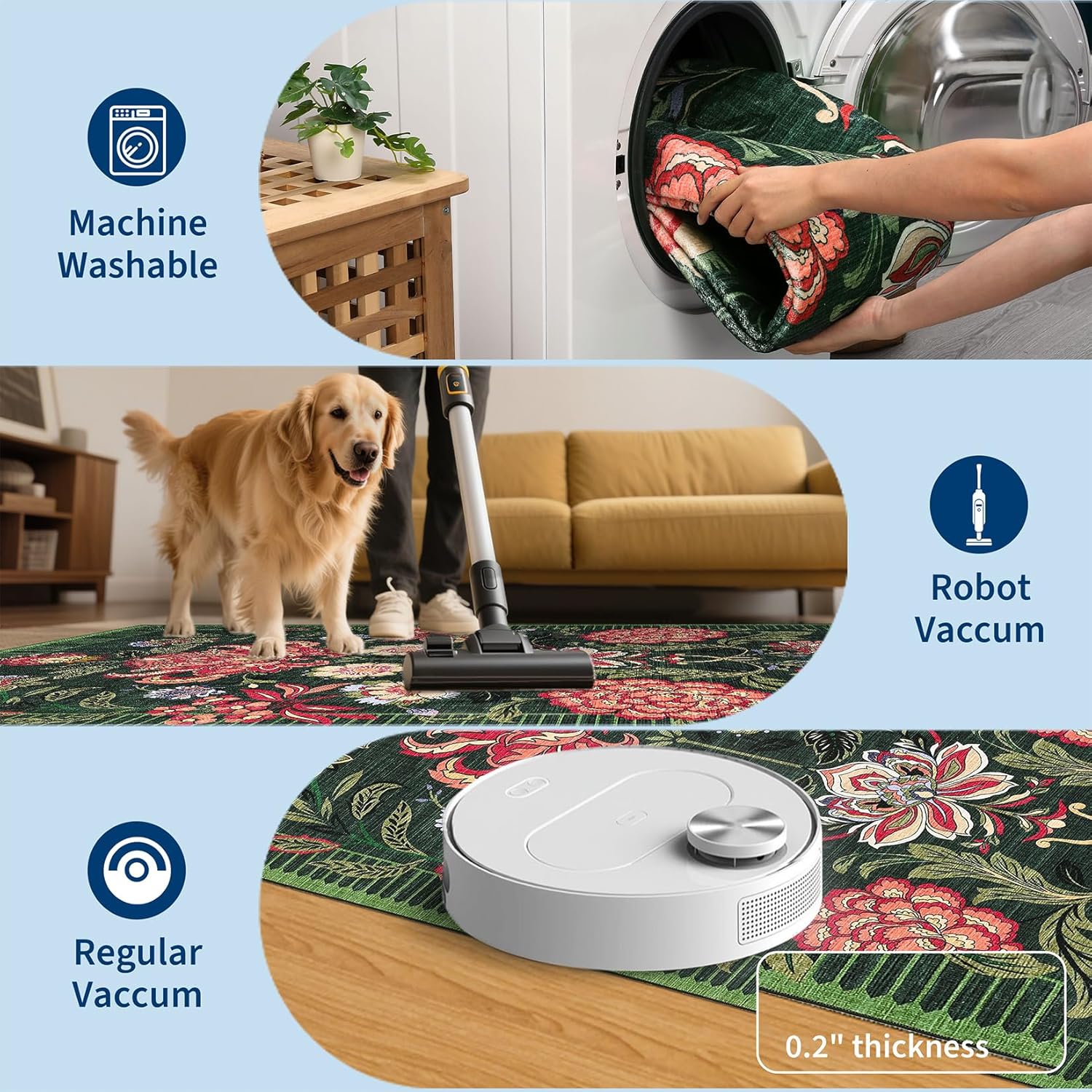 GarveeHome Forest Green Floral Botanical Washable 9x12 Rug for Living Room Soft Vintage Boho Cottage Large Rugs Low-Pile Carpet for Bedroom Dining Nursery Rug