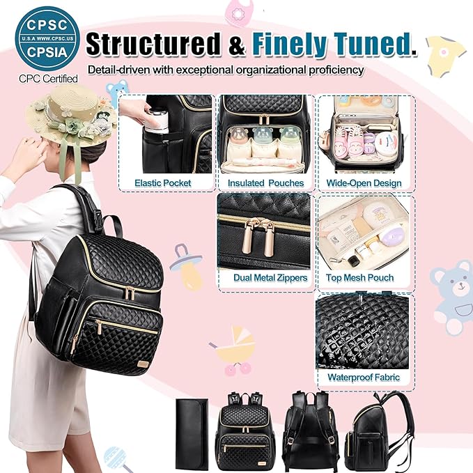 - 【Durable Build & Stylish baby bag】Baby diaper bag/ pañaleras para bebe With a sleek quilted design and gold-tone zippers, toddler diaper bag blends fashion and function. The high-quality faux leather diaper bag exterior resists wear, while the waterproof nylon interior protects contents. Available in multiple colors, it’s a diaper bag essentials for moms who want practicality without sacrificing style.