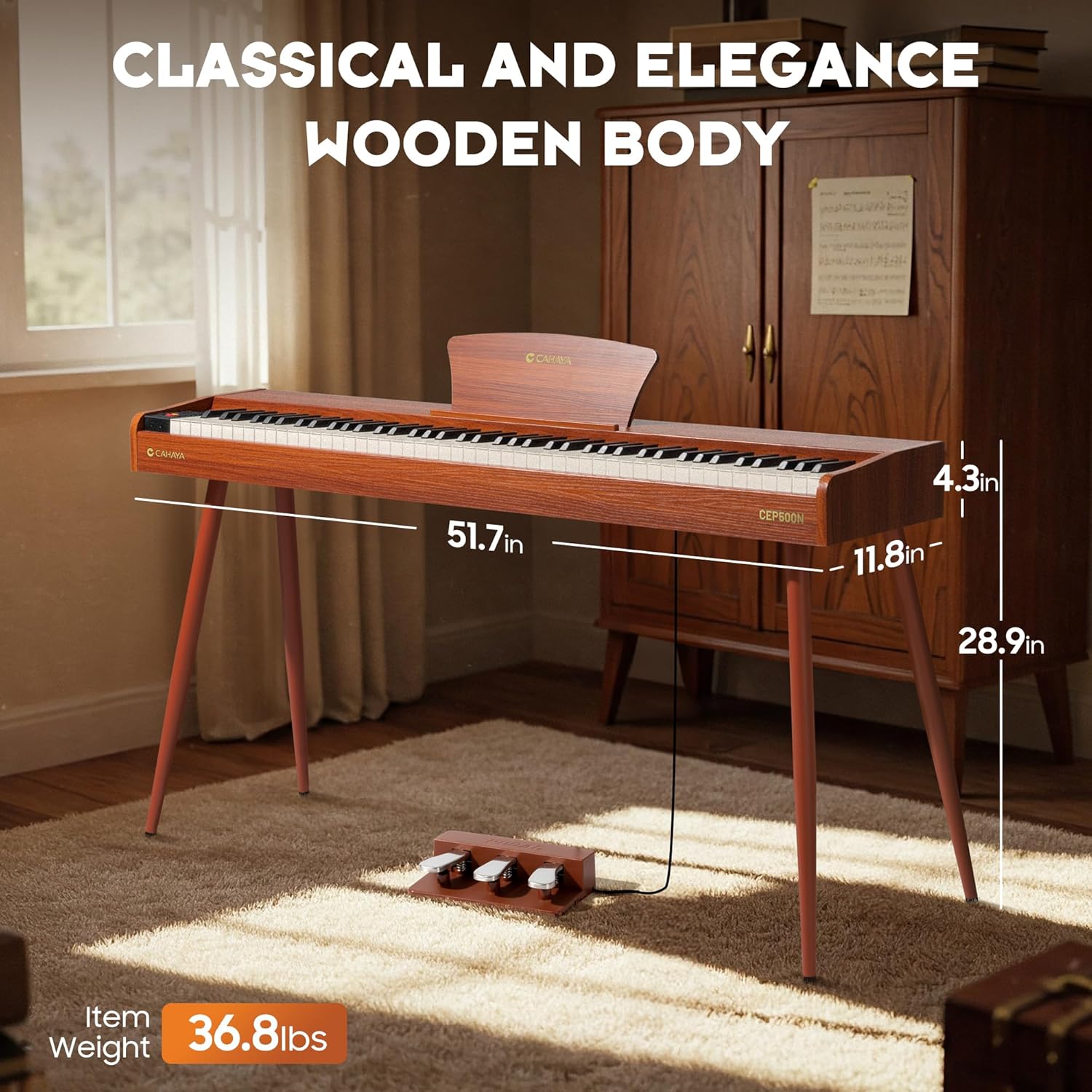 - Sturdy Construction: The digital piano 88 key weighted body is made from high-quality wood for excellent stability and long-lasting durability. The natural properties of the wood help maintain shape over time and withstand frequent use. In addition to its robust build, the wooden exterior adds a touch of elegance and classic charm, enhancing the instrument’s overall aesthetic and musical appeal.