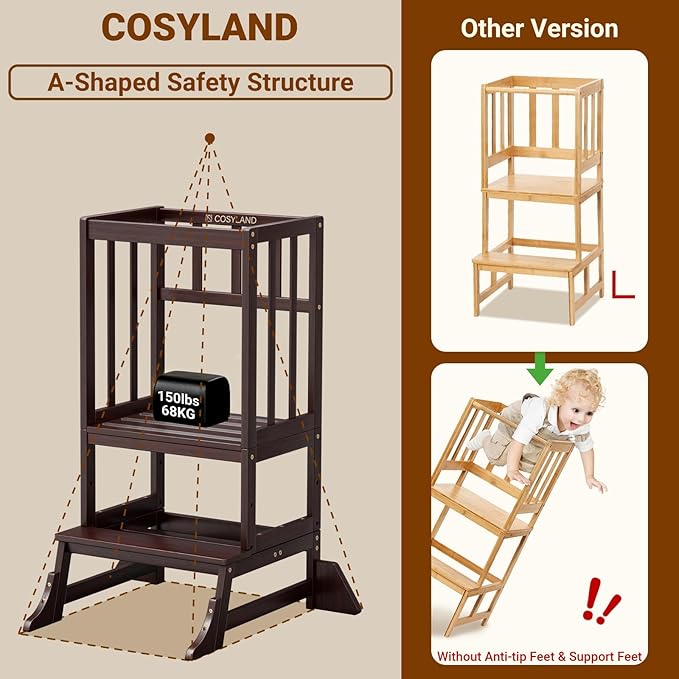 COSYLAND Height Adjustable Kitchen Stool for Toddlers – Portable Toddler Standing Tower for Learning and Cooking – Stable Kids Helper Tower with Stability Block for Kitchen Counter (Walnut)