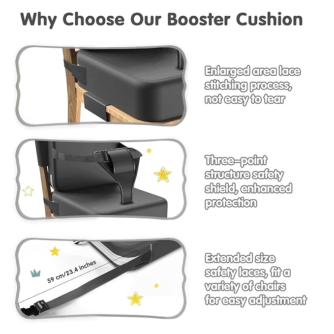 - Highlight 2 : Improved workmanship: Most cushions on the market have a strap length of 49 cm. After understanding customer needs, we lengthened the strap by 10 cm (4 inches), and the longest side of the strap reached 59 cm (23.3 inches), which is suitable for most dining chairs. We also reinforced the seams of the booster seat for table to effectively reduce the problem of loose seams and prevent the cushions from tearing