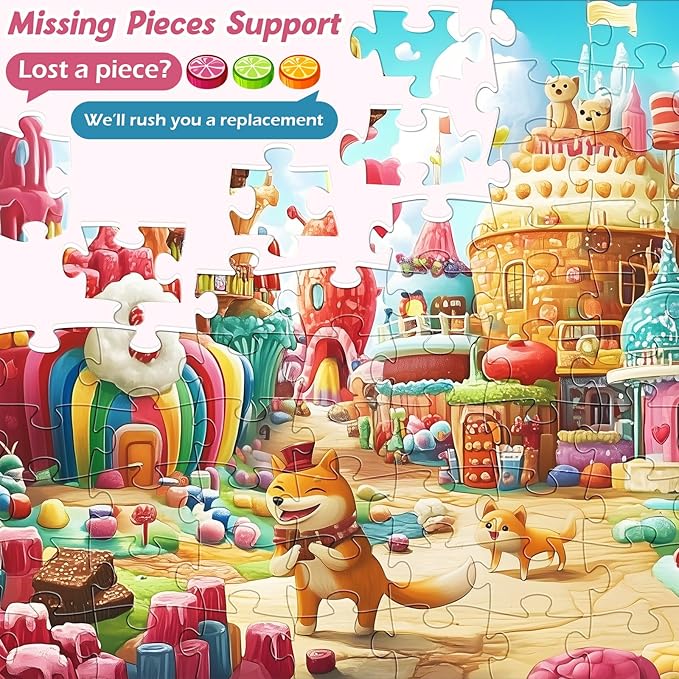 - Attractive Kids Candy Puzzle: Welcome to this sweet world made up of candy! Here, there are colorful oversized candies, towering chocolate castles,marshmallow clouds,and lollipop trees. A little fox and a little dog are eating candy here! This 100 piece puzzles for kids creates a dreamy and a joyful atmosphere!This kids puzzles ages 5-8 features bright colors and vivid scenes, which will attract children's interest and unleash their imagination