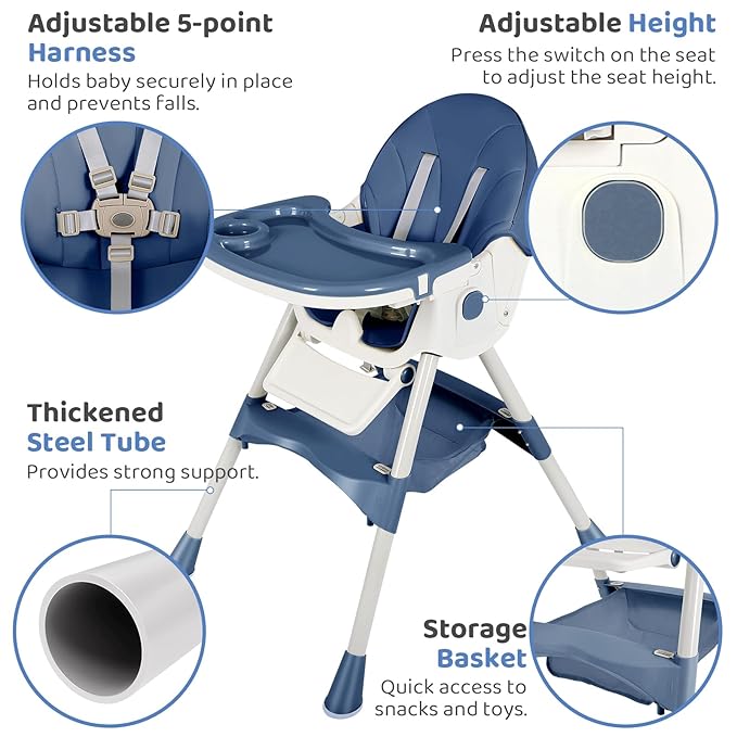 - 【Ultra-Safe & Sturdy 5-Point Harness】Designed with a 5-point safety harness and reinforced steel legs, our high chair for toddlers keeps your little one secure during meals. Non-slip feet and a wide base prevent tipping—ideal for active babies. ¡Silla de comer para bebé segura y estable!