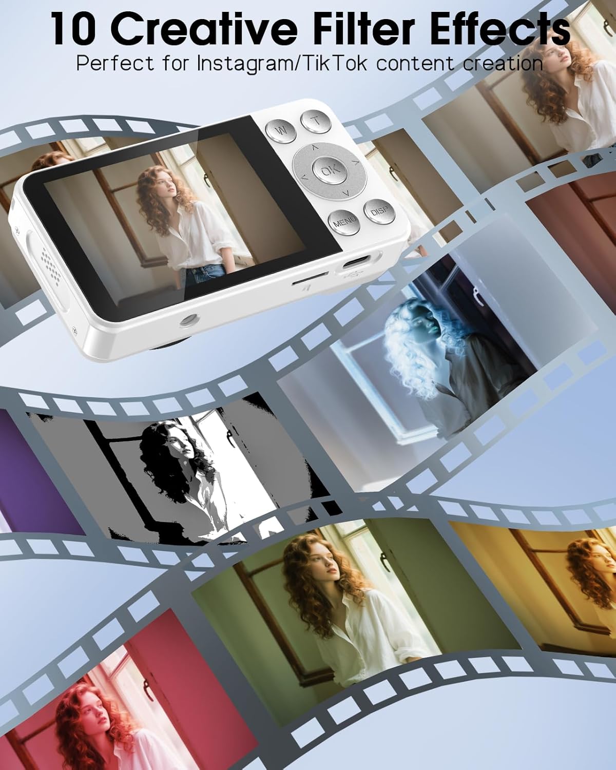 - Shoot Storytelling Images With Ease: This camera's portrait effect is professionally turned and focuses on portrait and close-up photography, perfect for shooting vintage atmosphere, “French oil painting” style photos in bright scenes, and easy to create popular socal media photos and videos without any retouching. 10 filter styles, fill light, more fun and creativity waiting for you to explore!