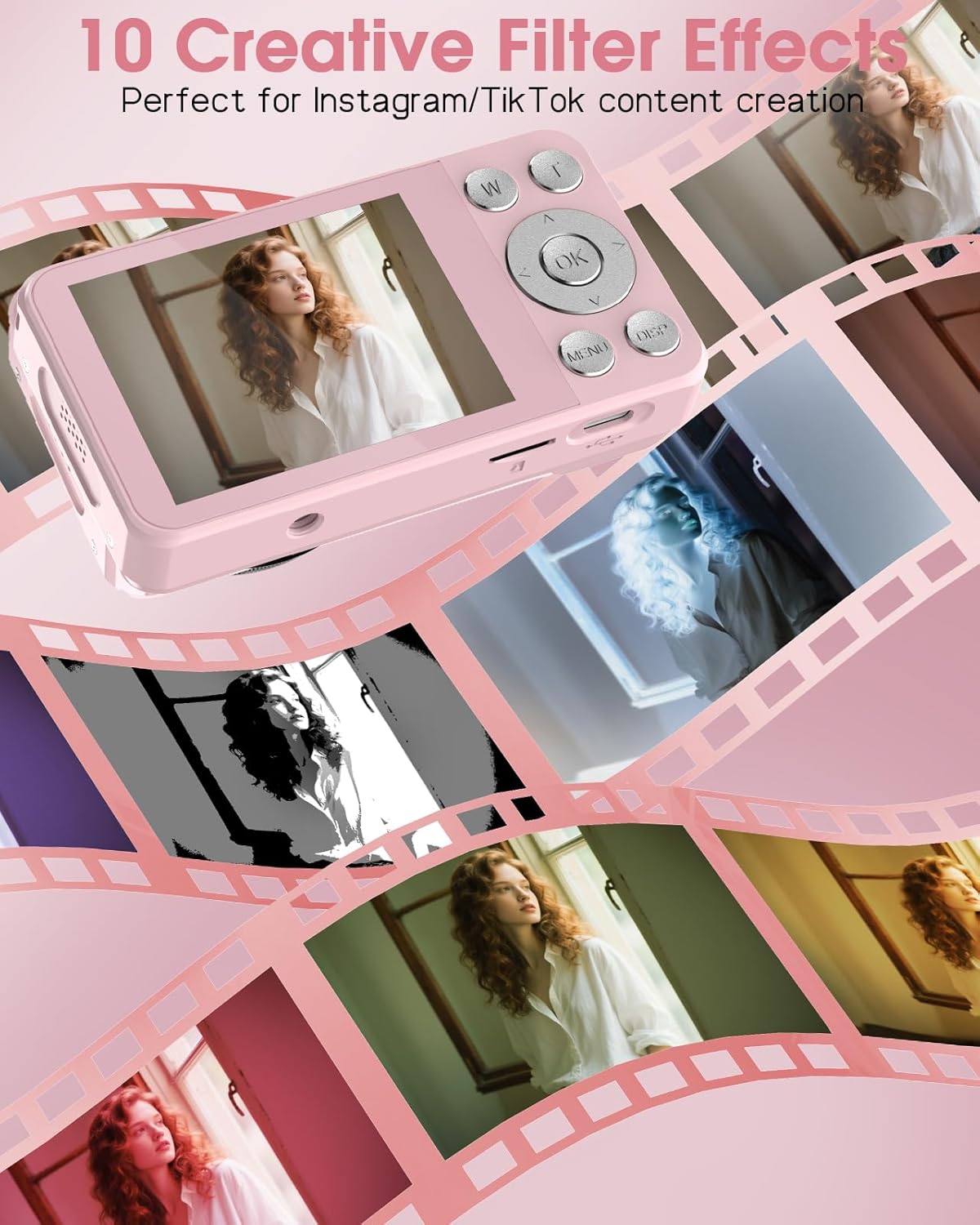 - Shoot Storytelling Images With Ease: This camera's portrait effect is professionally turned and focuses on portrait and close-up photography, perfect for shooting vintage atmosphere, “French oil painting” style photos in bright scenes, and easy to create popular socal media photos and videos without any retouching. 10 filter styles, fill light, more fun and creativity waiting for you to explore!