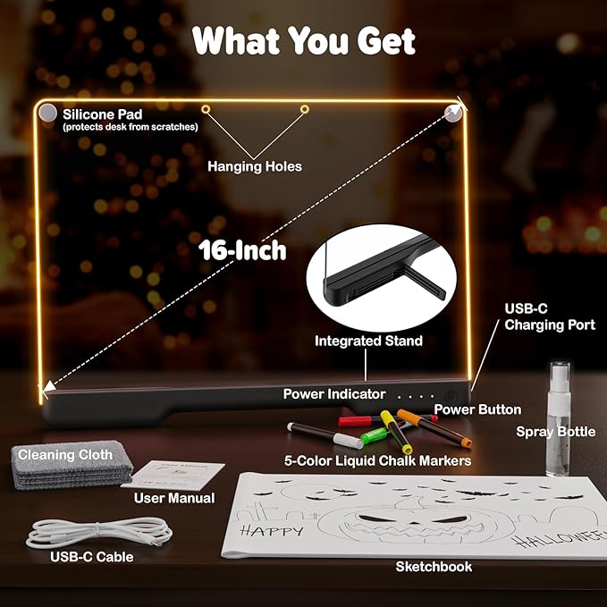 - [Rechargeable & Mess-Free Fun]: Power up creative fun anywhere! The rechargeable LED note board is free from cables and perfect for displaying art and sketching artistic expression