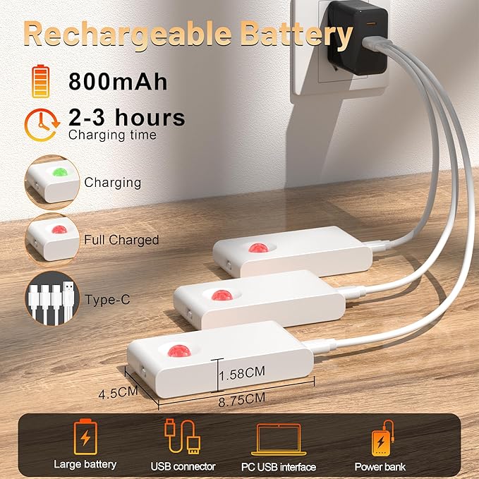 - 【Efficient Rechargeable Battery】The built-in 800mAh battery supports up to 100 hours of continuous use or 2 months in motion sensor mode. The Type-C charging cable allows convenient recharging.