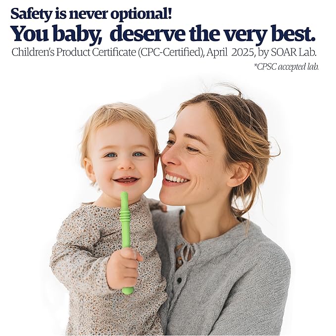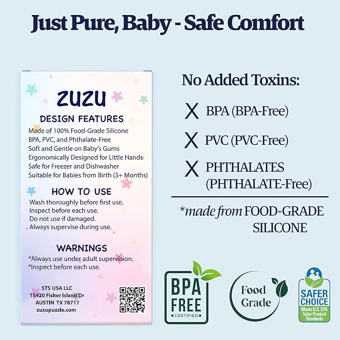 - CPC Certified, ASTM & CPSIA Approved: Your baby’s safety is our top priority. Zuzu's premium teether is made from food-grade silicone and undergoes rigorous quality checks to meet and exceed industry-leading safety standards including ASTM F963-23 and CPSIA regulations. Each teether is independently tested and approved by a CPSC-certified laboratory, ensuring it’s free from harmful substances and safe for daily use. Backed by a Children’s Product Certificate (CPC), Zuzu delivers unmatched peace of mind for parents and gentle, worry-free comfort for babies.