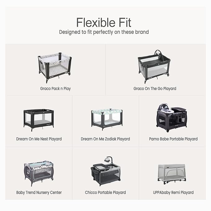 - Flexible Fitted: Designed to flexibly fit most standard Pack n Play mattresses, these playard sheets fitted for Graco, Baby Trend, Dream On Me, Chicco, UPPAbaby, and other major brands. The smart stretch design effortlessly accommodates most playard while maintaining a secure fit.