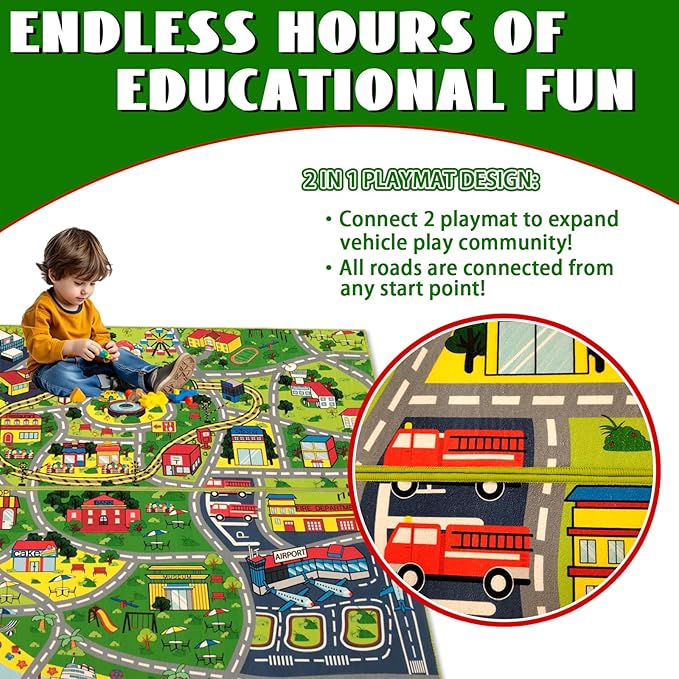 - Interactive Road Design: Features city maps, roads, and parking spaces to spark imaginative car rug play mat