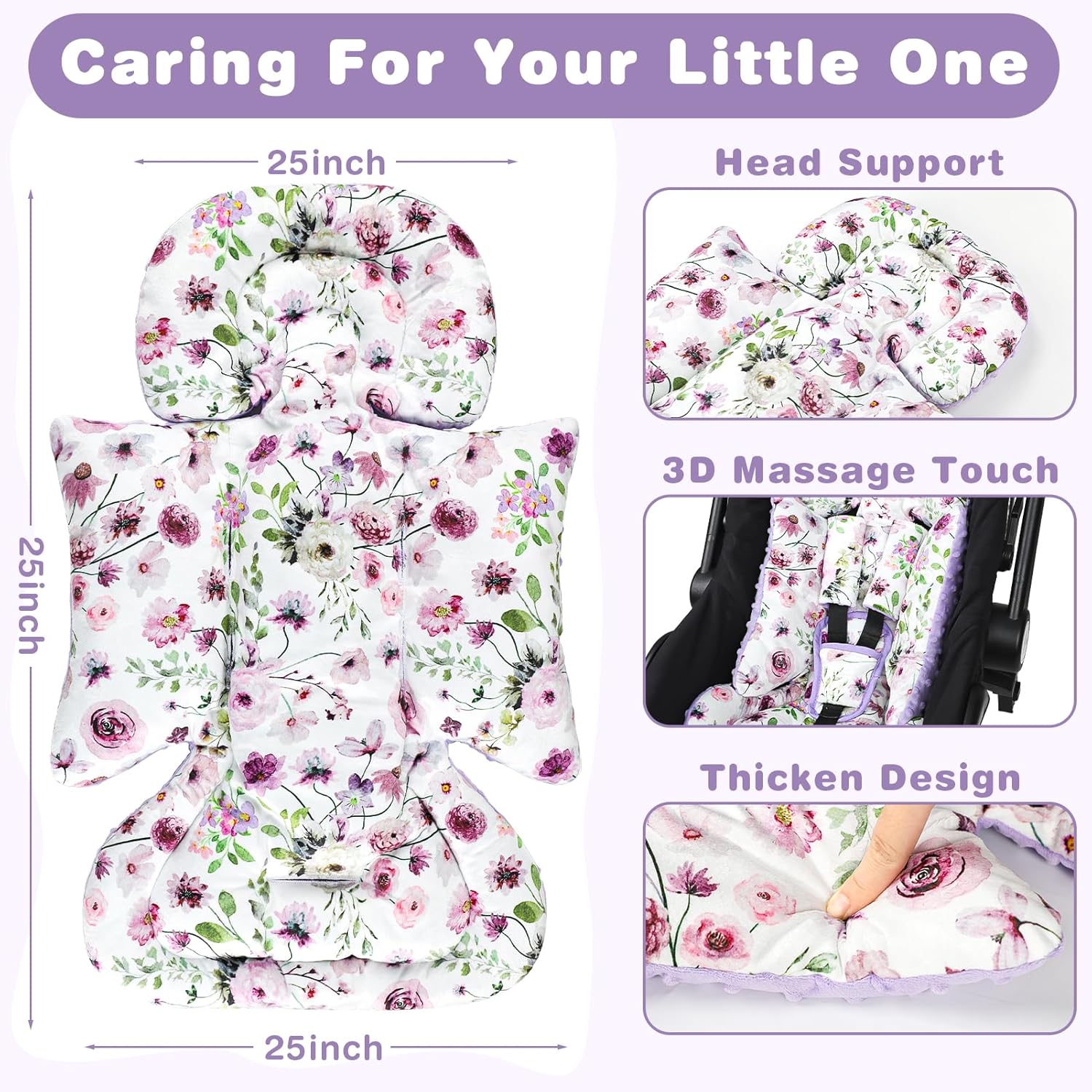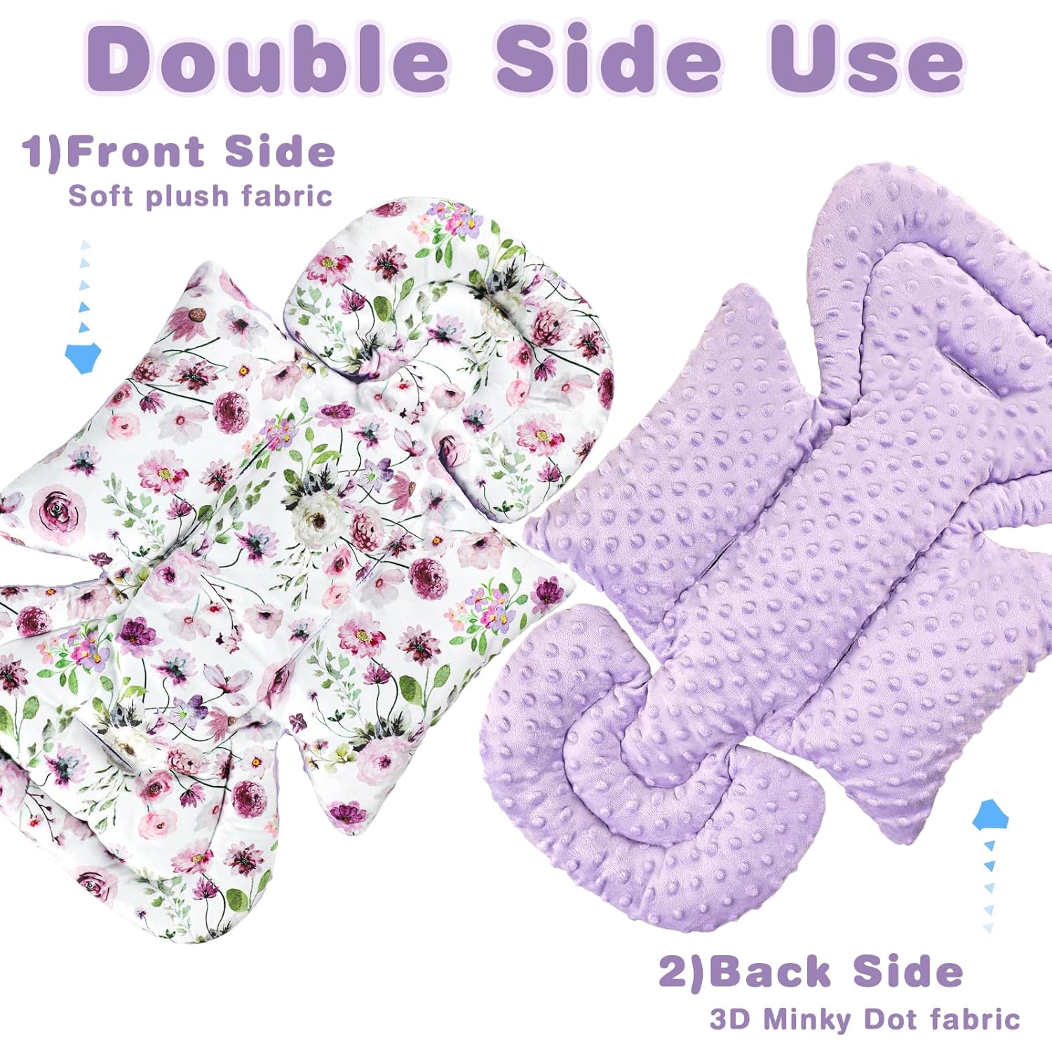 3-in-1 Infant Car Seat Insert, Soft Head and Body Support,Ultra & Strap Covers Set, Reversible Newborn Car Seat Cushion Pad for Baby Boy & Girl fits Stroller, Swing, Bouncer (Purple Flowers)