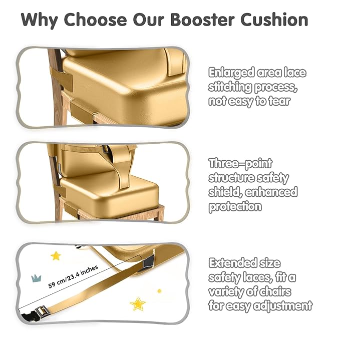 - Highlight 2 - Improved workmanship: Most cushions on the market have a strap length of 49 cm. After understanding customer needs, we lengthened the strap by 10 cm (4 inches), and the longest side of the strap reached 59 cm (23.3 inches), which is suitable for most dining chairs. We also reinforced the seams of the booster seat for table to effectively reduce the problem of loose seams and prevent the cushions from tearing