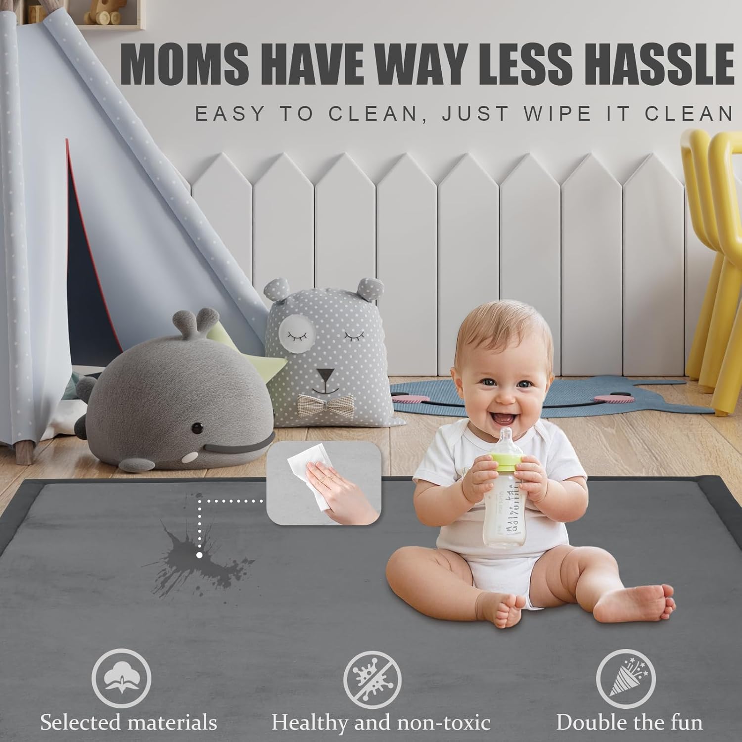 - EASY TO CLEAN & SAVE WORRY AND EFFORT: Mothers' parenting life is busy, how can cleaning problems make it more chaotic? The surface is designed to be easy to clean, making it perfect for busy parents. Facing various stains left by babies when playing, just wipe it gently with a damp cloth, and our baby play mats for floor can be quickly restored to cleanliness, easily helping you solve cleaning troubles and creating a hygienic play environment for your baby