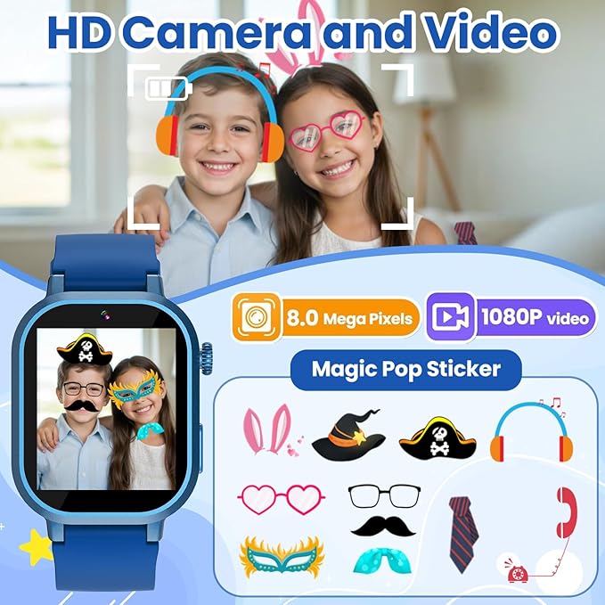 - 【HD Camera & Video】: The kids watch is equipped with a high-definition camera, allowing children to clearly record every happy moment in life. Children can use the built-in cute stickers to take some interesting photos with their families or friends. The smart watch for kids can store 15,000+ photos or 6+ hours of video.