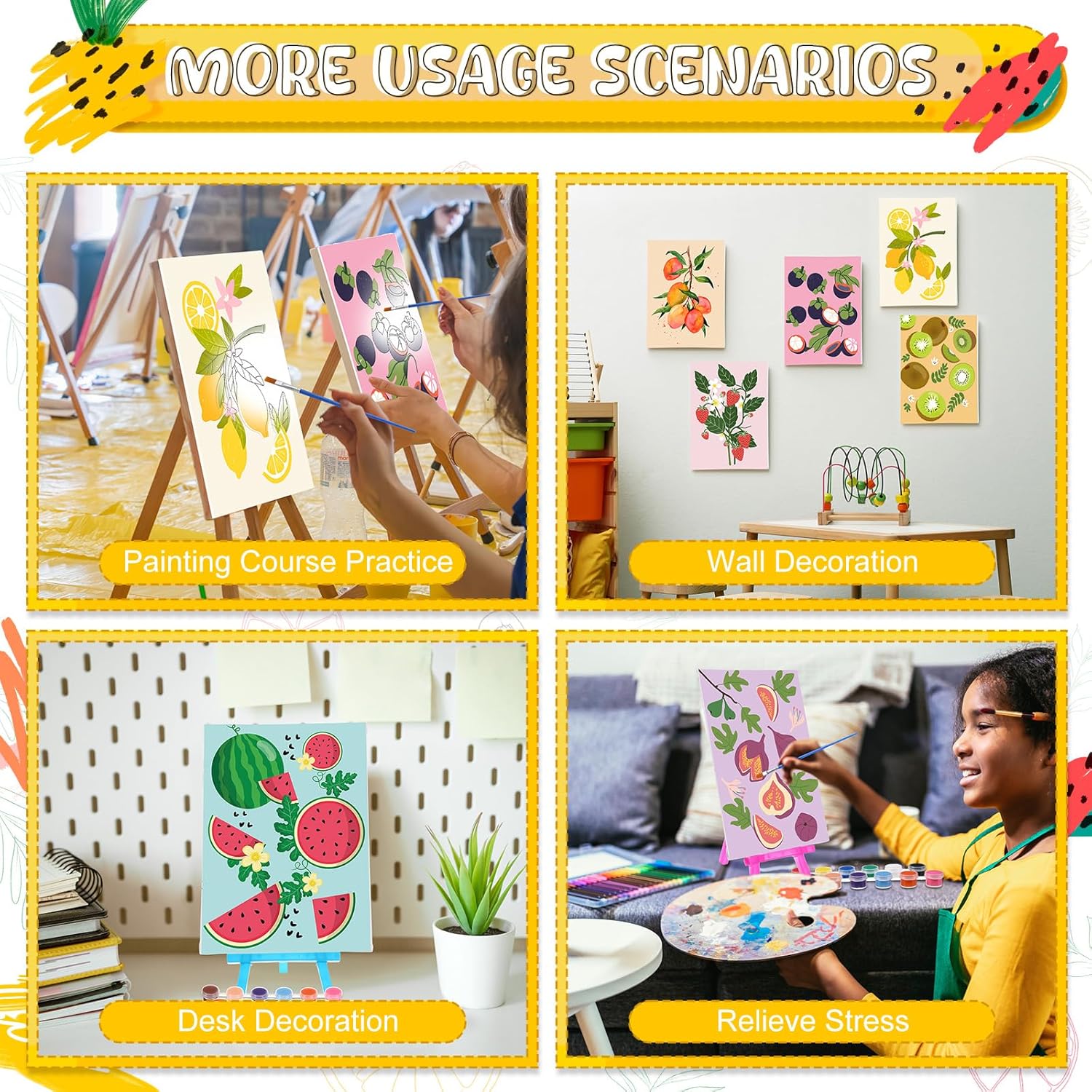 - 10 Pre Printed Canvases: 10 kinds of fruit patterns are engraved on the pre drawn board; Include Strawberries, watermelon, lemon, pomegranate, banana and other patterns, the size of: 7 x 5 x 0.1inch/18 x 13 x 0.3cm, cute and easy, you can use the provided paint to color according to your own aesthetics, improve your painting creativity in the process, and also reduce stress and relieve anxiety