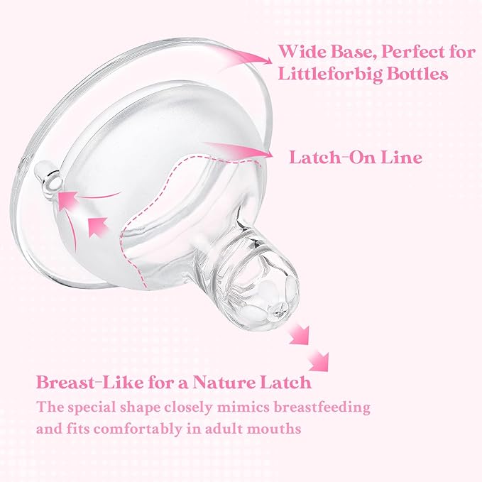 - Comfortable, Natural Fit: These bottle nipples feature a natural shape and soft texture that fit comfortably in the mouth, closely mimicking the feel of breastfeeding. Measuring 1.73" long by 1.97" wide, they are fully compatible with standard 1.97 in (50 mm) wide-mouth bottles - perfectly fitting Littleforbig Adult Bottles and similar designs. Please note: bottles sold separately.