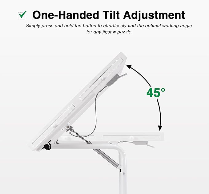 - 【One-Handed Tilt Adjustment】With the premium gas-powered pneumatic tilt mechanism, this puzzle table allows for smooth, one-handed angle adjustment. Simply press and hold the button to effortlessly find the optimal working angle for any jigsaw puzzle—say goodbye to clunky pins and fixed positions.
