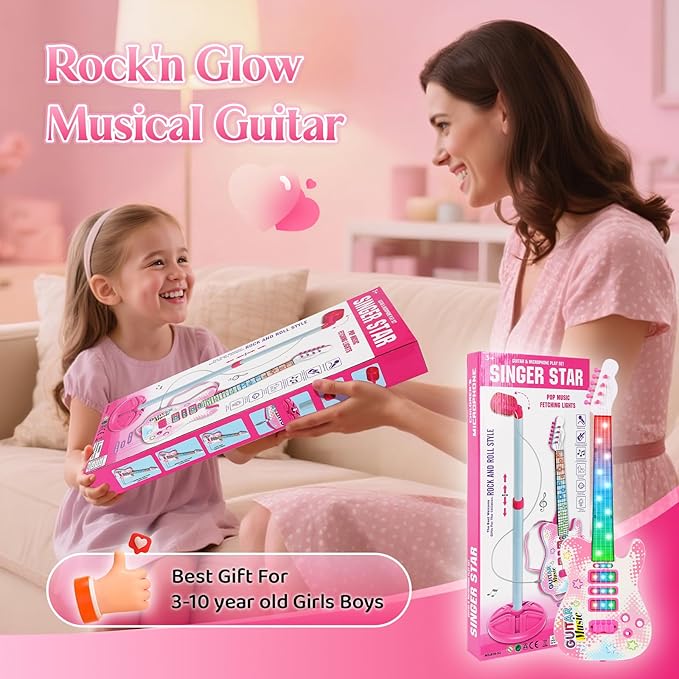 - 【Perfect Christmas Gifts for Girls】——Portable pink guitar microphone karaoke set, has a beautiful palace pattern and a gift box packaging design, is a musical toys for baby toddler girls Christmas birthday gifts, 1 2 3 4 5 6 7 8 year old girls Easter, New Year, Thanksgiving, children's Day and holiday gifts.