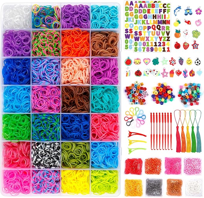 - 【RUBBER BANDS SET】Our set comes with all the necessary tools for Bracelet Making. 18,950+ premium quality rubber bands, 600 S-Clips, 252 Beads, 10 Backpack Hooks, 8 Crochet Hooks, 30 charms, 3 Hair Clips, 5 Tassels, 2 ABC Stickers and 1 Instruction. Comes with a container to keep all pieces neatly organized.
