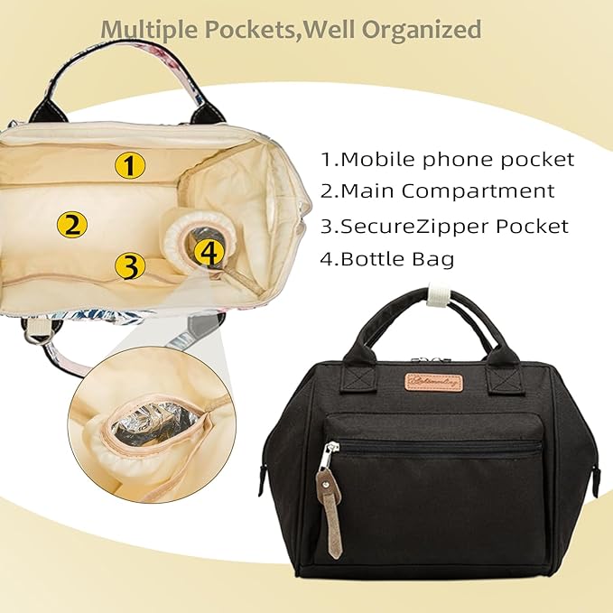 - Multifunctional Diaper Bag-This small diaper bag has all the space and pockets you need for baby and mommy supplies.The front side pocket can store a cell phone, the middle main compartment can hold a number of baby products, with an insulated insulated bottle pocket and two pockets for storing diapers.