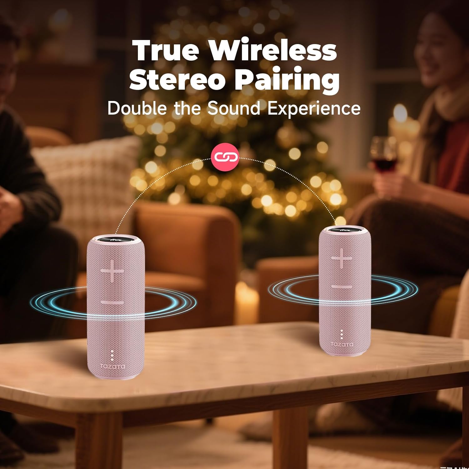- TAZATA 30W RMS / 45W Peak Sound: Experience premium 360° audio with deep bass from this compact yet powerful Bluetooth speaker. Our proprietary acoustic engineering delivers surprising volume for its size. Enjoy crystal-clear audio and rich bass from this compact pink Bluetooth speaker, delivering immersive sound for music, parties, and outdoor adventures.