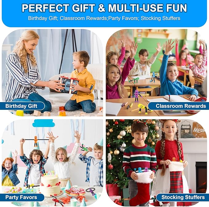 - 6 Fun Robot-Shaped Toys – Includes 6 colorful robots (red, yellow, blue, green, purple, orange) with stretchy pop tube arms & legs for endless bending, twisting, and sticking fun!