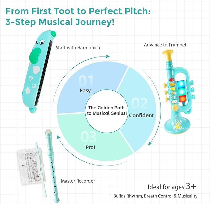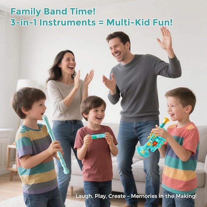 - 【3-in-1 Musical Adventure】 This set includes a trumpet, harmonica, and recorder, allowing kids to explore diverse sounds—from the trumpet’s vibrant melodies to the harmonica’s breath-controlled tunes and the recorder’s clear notes. Perfect for creating instant family band sessions